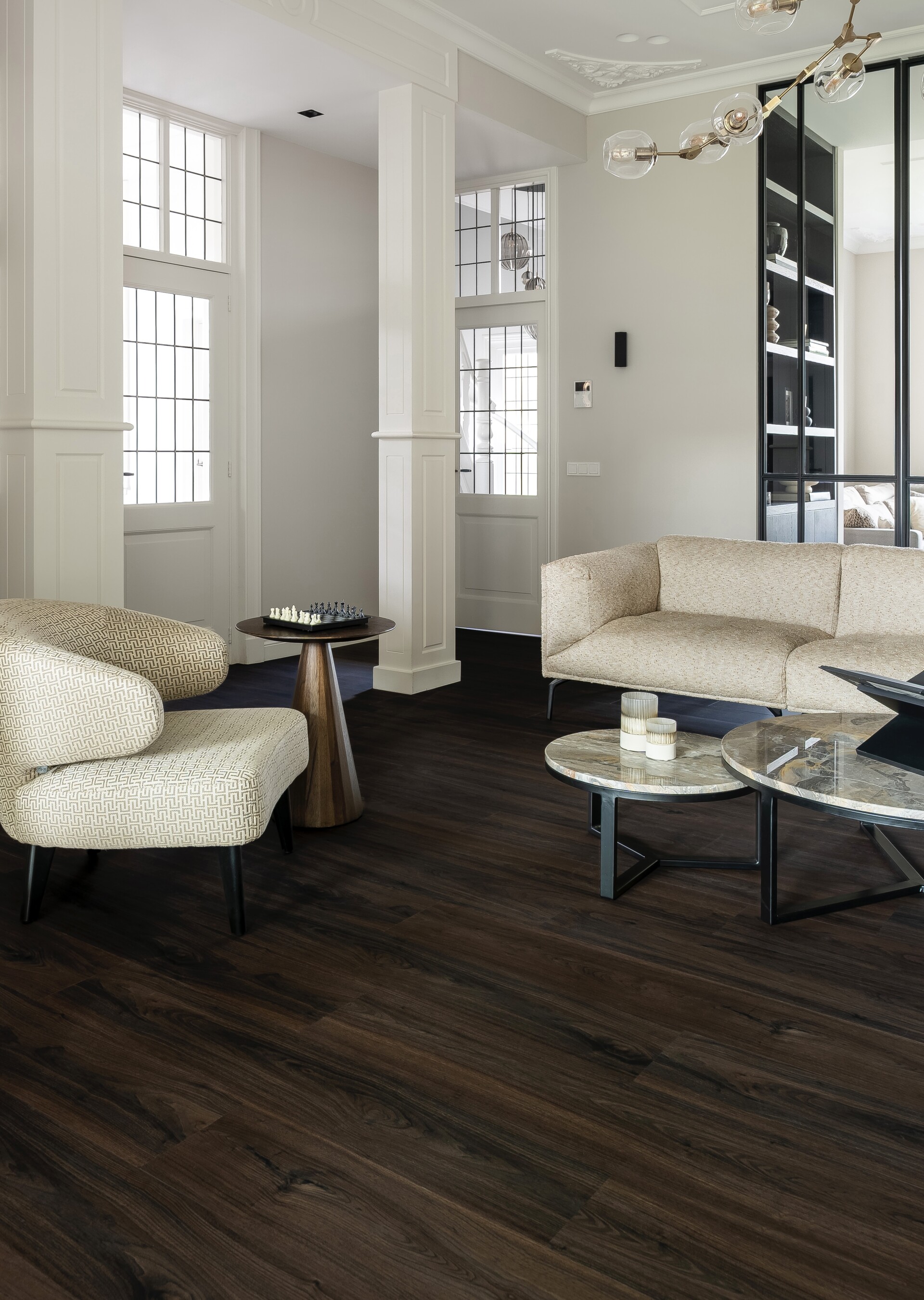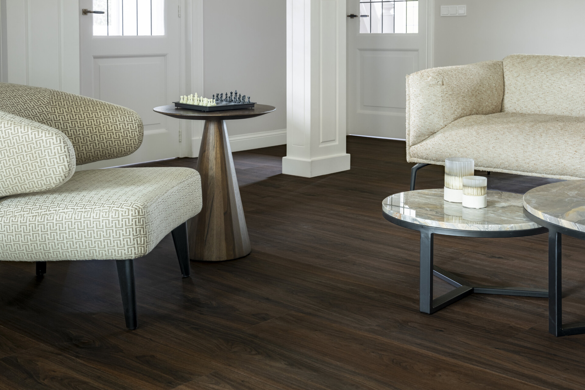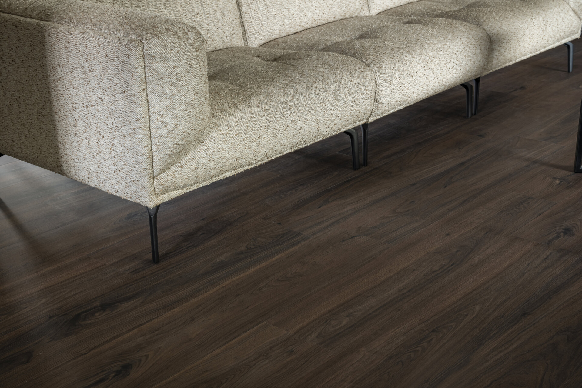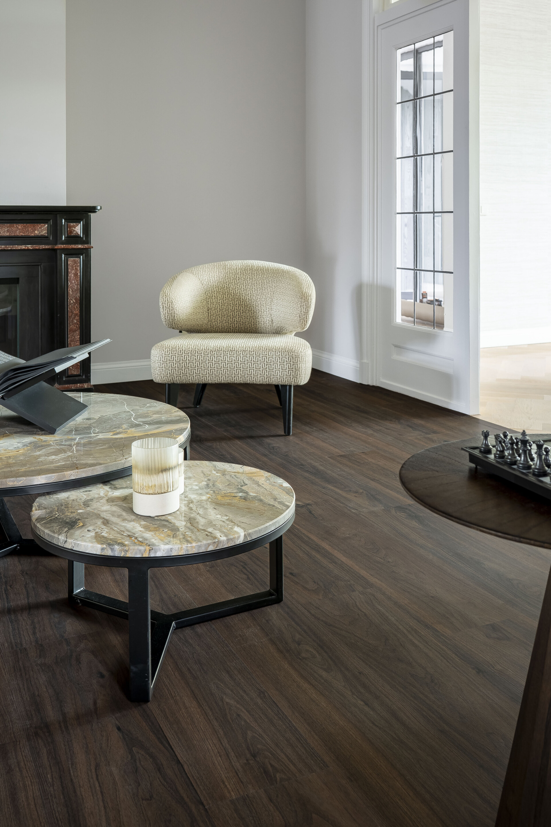 Tmavá podlaha tvoří pevný základ prostoru a přináší do interiéru teplo. V kombinaci se světlými textiliemi a skleněnými prvky vzniká interiér založený na kontrastu a rovnováze.