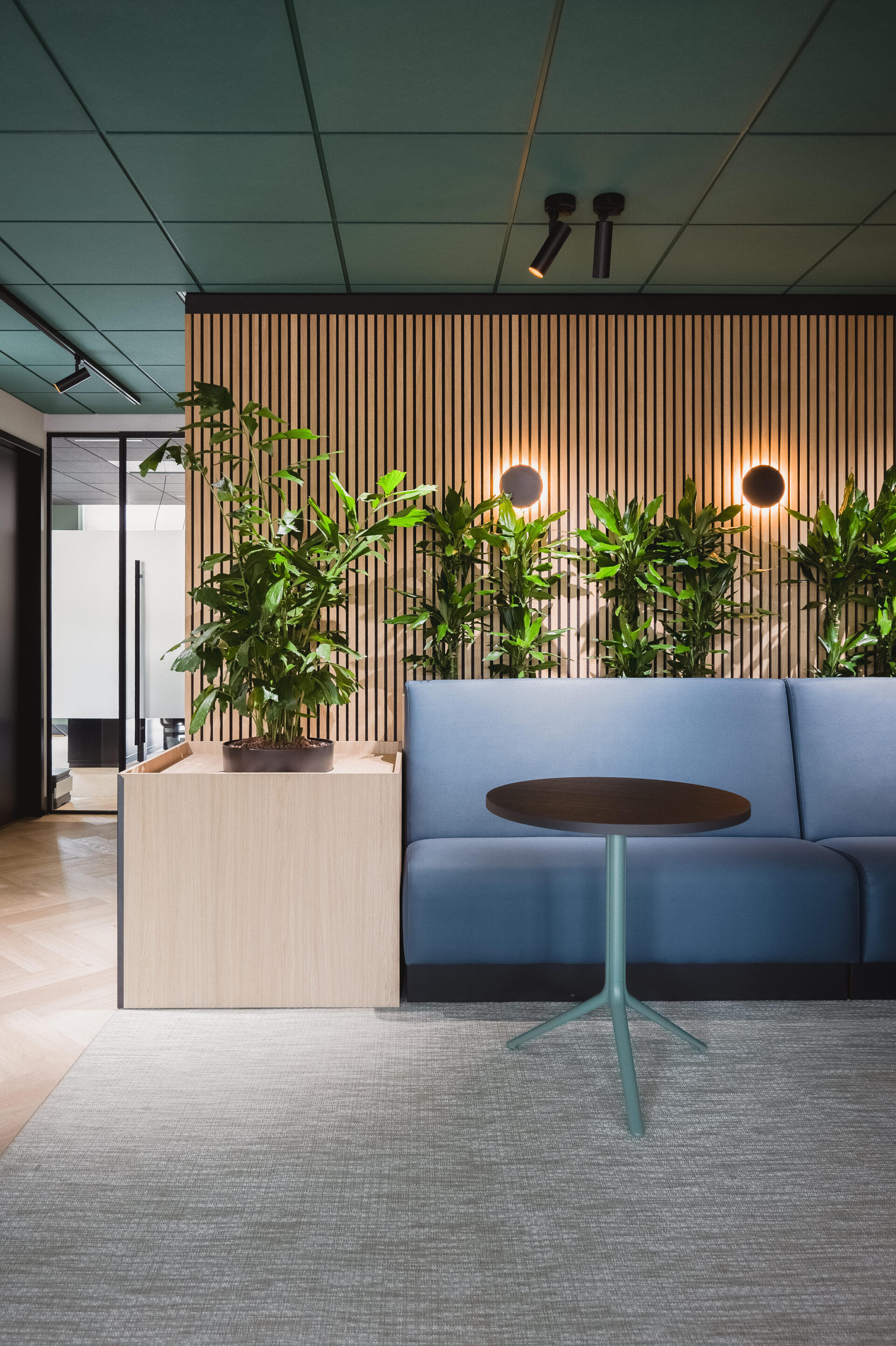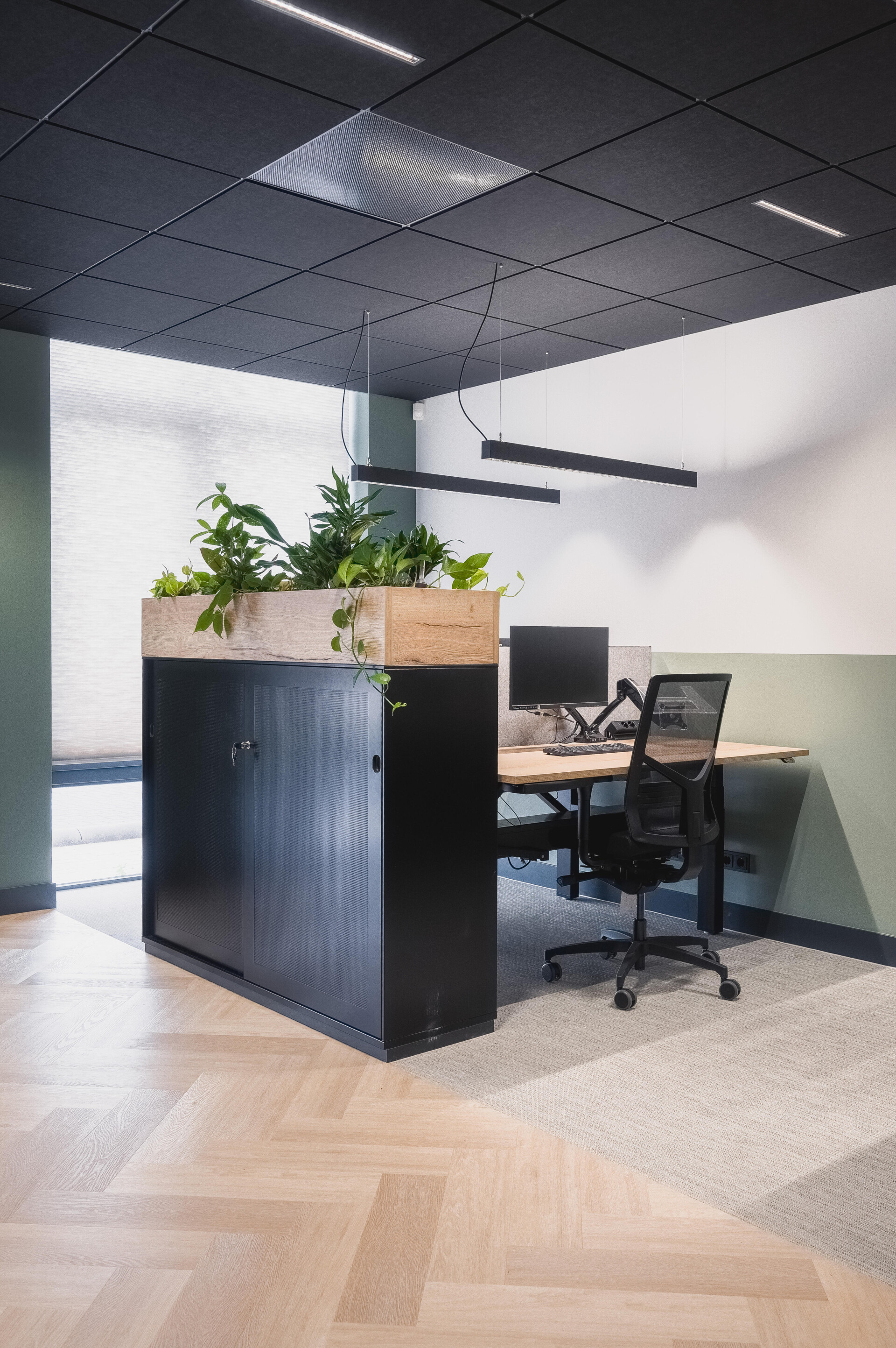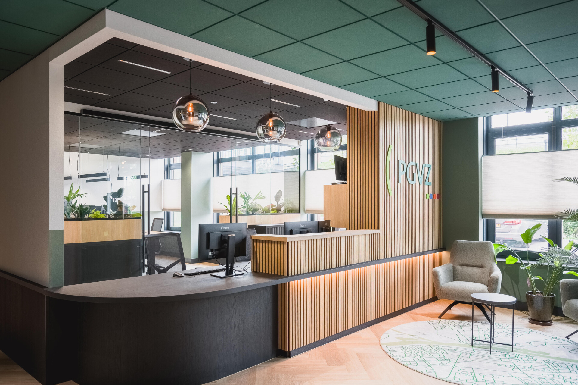 Nové sídlo si zaslouží nový a vhodný interiér. Hlavním motivem tohoto projektu je barva zelená, inspirovaná vizuální identitou PGVZ Domácí Péče. Ta byla zkombinována s klidnými odstíny a přírodními materiály, aby vzniklo relaxační pracovní prostředí. Prostor je členěn skleněnými příčkami, které vytvářejí otevřenou a dynamickou atmosféru navozující pocit přívětivosti.