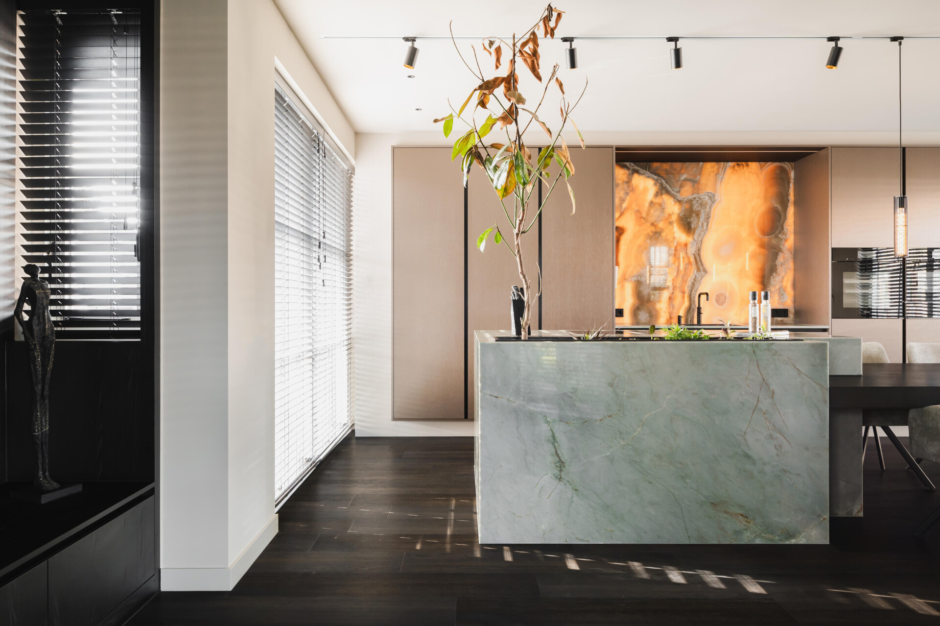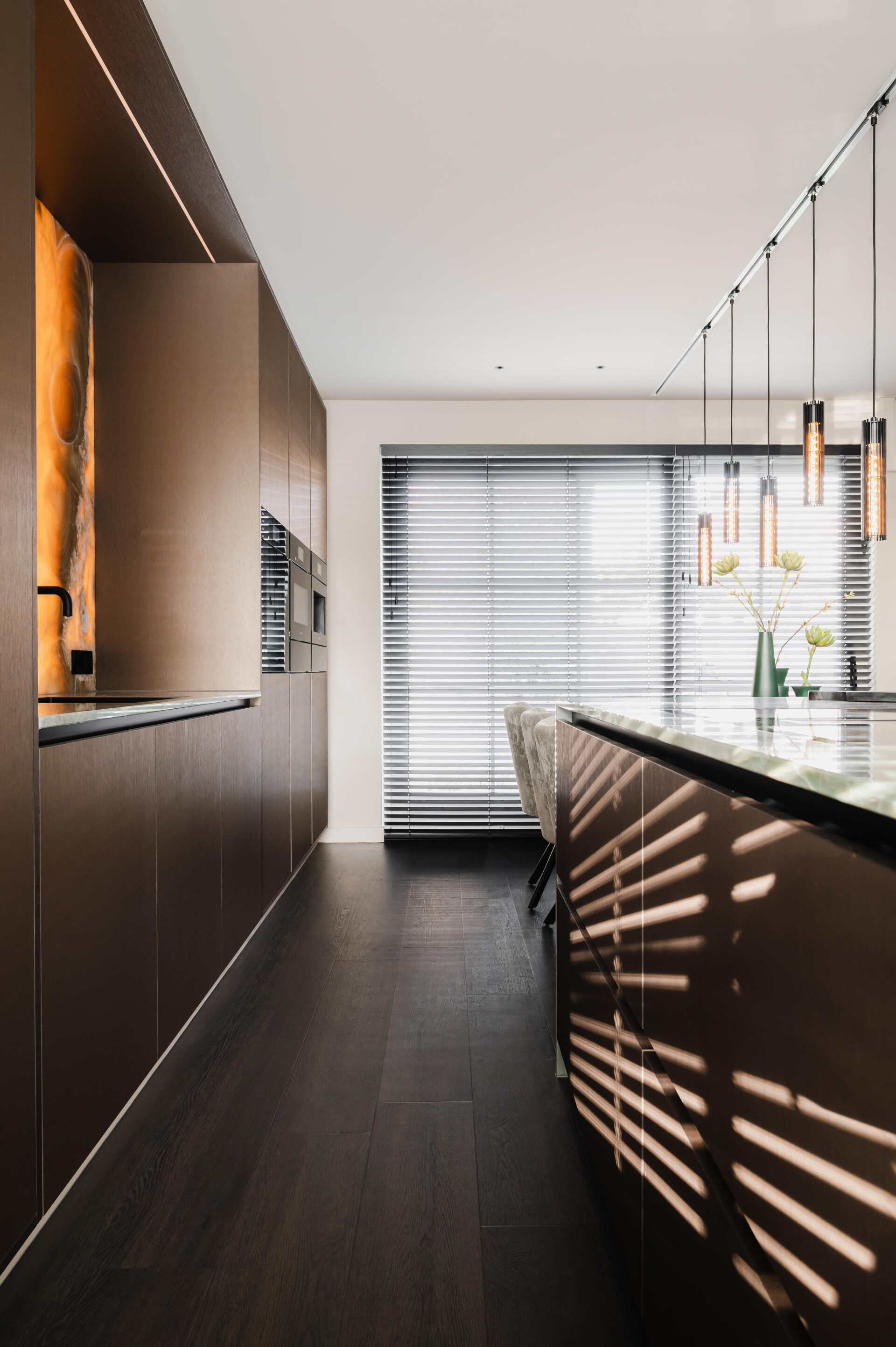 Centaine Creations uplatnila svůj návrhářský talent v tomto krásném domě v Apeldoornu. Proběhla kompletní proměna, při níž byl interiér obnoven v rafinovaném hotel chic stylu. Na míru vyrobený televizní kout a kuchyně dodávají celkové estetice dokonalý nádech exkluzivity. Volba tmavé podlahy v dlouhých prknech je do interiéru bezchybně začleněna a vytváří čistou a prostornou atmosféru, která dokonale ladí se stylem domu.
